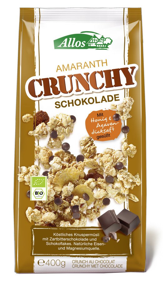 Die lecker gerösteten Hafervollkornflocken und die Amaranthcornflakes sind nur mit Honig gesüßt. Zart schmelzende Schokoplättchen (mit einem Kakaogehalt von mindestens 55%) und Schokoflakes verleihen unserem Amaranth Crunchy Schokolade seine feinherbe Note.
