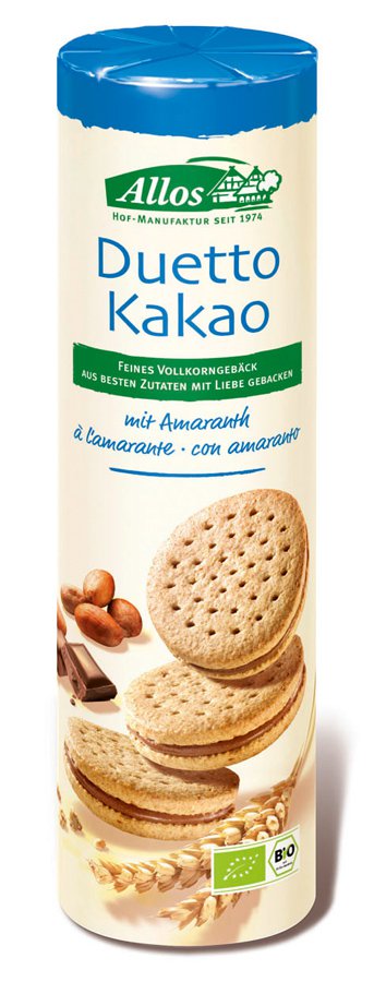 Zwei knusprige Kekse mit Amaranth, lecker gefüllt mit einer schokoladigen Cremefüllung: Das sind die unwiderstehlich leckeren Doppelkekse von Allos. Doppelter Keks-Genuss für Zwischendurch!
